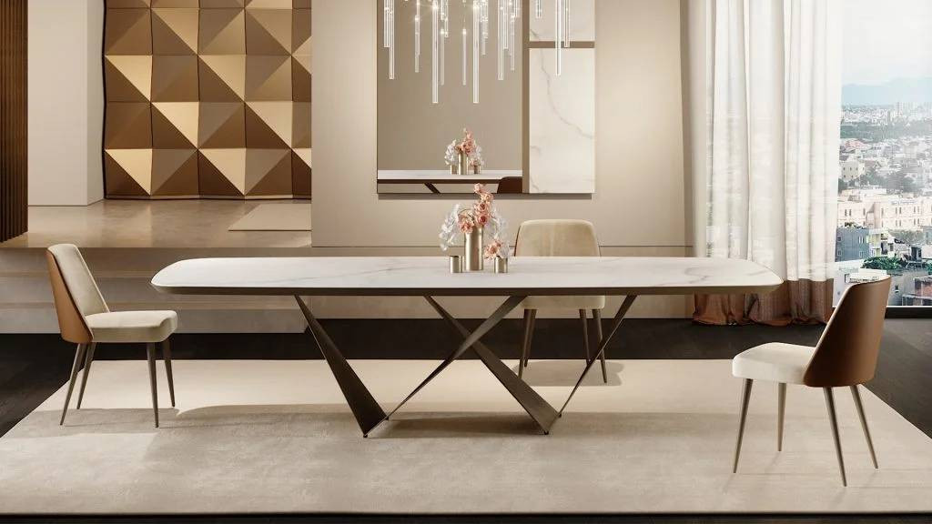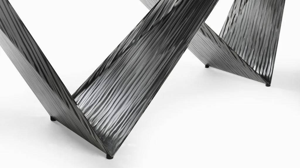 Le design de la Prisma 72 Steel ne sacrifie jamais la fonctionnalité à la forme. Sa base, composée de deux éléments métalliques sculpturaux qui s'entrecroisent, est une prouesse d'ingénierie. Elle assure une stabilité absolue, capable de supporter des plateaux pouvant atteindre trois mètres de long, tout en libérant un espace généreux pour les jambes. Cette ergonomie invisible est le fruit d'études approfondies sur la circulation autour de la table, garantissant que chaque convive bénéficie d'un confort optimal lors des réceptions les plus prolongées.