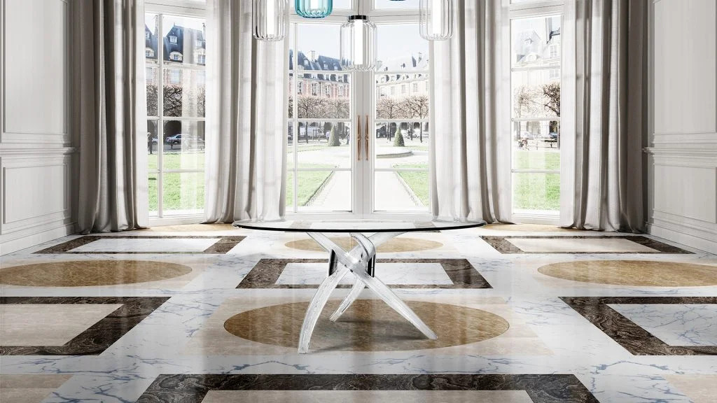 La table Fili D'erba 72 est une pièce maîtresse qui exige un environnement à sa mesure. Pour maximiser son impact visuel, nous recommandons une installation sous un éclairage zénithal direct, tel qu'un lustre en cristal de Murano ou une suspension architecturale LED minimaliste. La lumière traversant le plateau en verre extra-clair viendra se briser sur les courbes de la base, créant des jeux d'ombres et de reflets dynamiques au sol. Dans un intérieur moderne, elle s'accorde parfaitement avec des assises aux lignes épurées et aux textiles riches comme le velours ou la soie sauvage. Sa polyvalence de formes — ronde pour l'intimité, ovale pour la fluidité, ou rectangulaire pour le prestige — lui permet de s'intégrer aussi bien dans une salle à manger formelle que dans un atrium de réception luxueux. Son style Organic Glamour en fait le pont idéal entre le minimalisme contemporain et l'opulence classique.