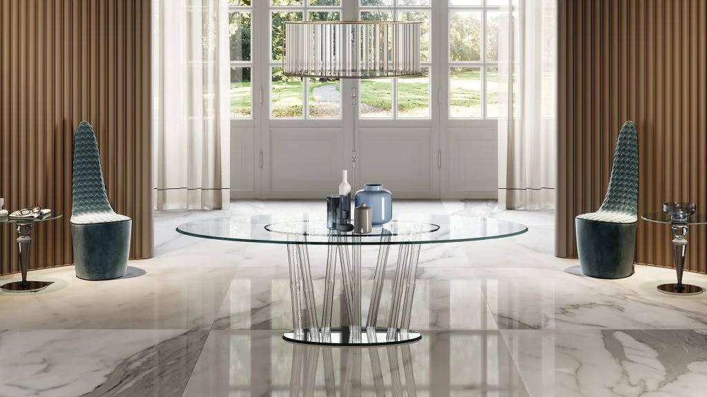 Pour magnifier la Bamboo 72, l'emplacement et l'éclairage sont primordiaux. En raison de sa structure en verre filigrané, nous recommandons de placer la table sous un lustre imposant, idéalement un modèle en cristal de Murano de chez Reflex, pour créer un jeu de réflexions infinies entre le plafond et la base. Dans un intérieur contemporain, elle se marie parfaitement avec des sols en marbre ou en parquet de chêne clair. Pour un style 'Neo-Glamour' affirmé, associez la version MarmoReflex Calacatta avec des chaises revêtues de velours sombre. La transparence de la base permet de jouer avec des tapis aux motifs géométriques qui resteront visibles sous la table, ajoutant une couche de complexité visuelle à votre décoration.
