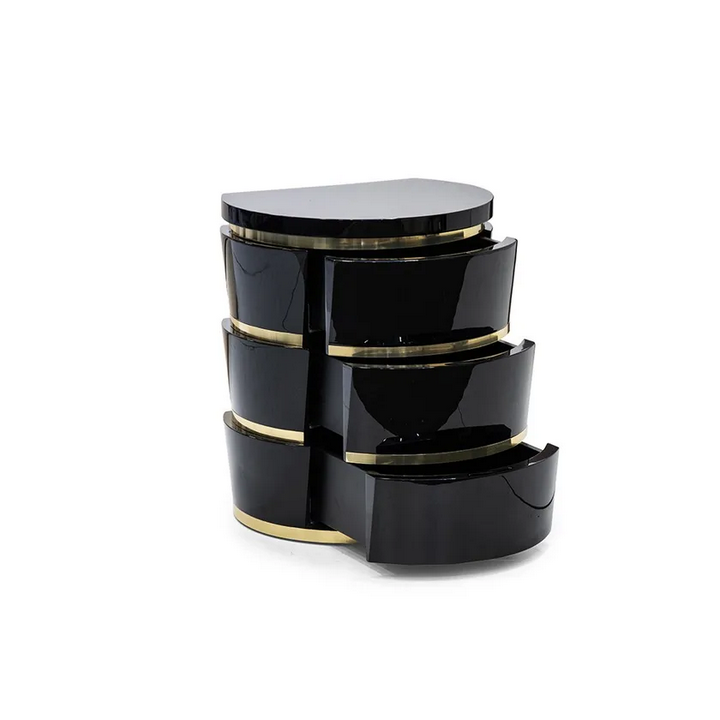 Il tavolino da notte ovale con cassetti in nero e oro di MUZIO è un'aggiunta straordinaria a qualsiasi interno moderno. Questo tavolo notte rotondo è progettato con una struttura lucida nera laccata, completata da eleganti inserti in metallo dorato. Il suo design unico non solo migliora l'appeal estetico del tuo spazio, ma offre anche soluzioni pratiche di stoccaggio. Perfettamente adatto per camere da letto, soggiorni o come pezzo di dichiarazione in qualsiasi area, questo tavolo combina bellezza e funzionalità senza soluzione di continuità.