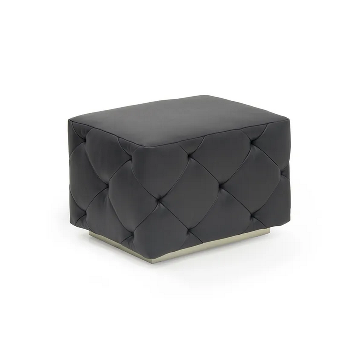 Il pouf presenta un design tufted meticolosamente realizzato che aggiunge profondità e texture, migliorando il suo complesso fascino estetico. La superficie liscia in pelle offre un'esperienza tattile, mentre i dettagli di cucitura decorativa evidenziano l'artigianato coinvolto nella sua creazione. La forma geometrica del pouf e le sue proporzioni raffinate contribuiscono al suo aspetto sofisticato, assicurando che diventi un punto focale nel tuo design d'interni.