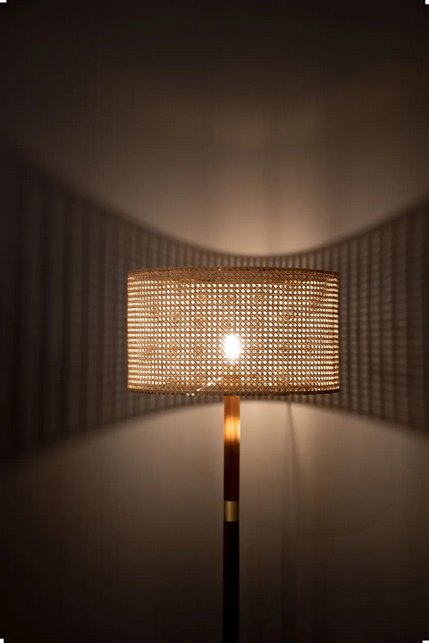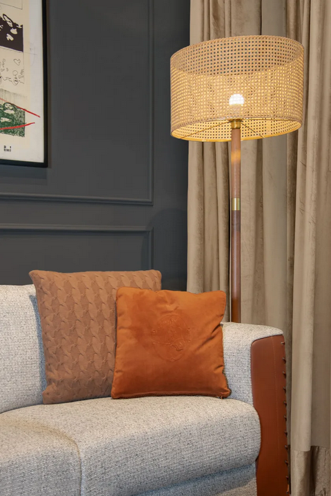 Il design della lampada mostra attenzione ai dettagli, con elementi decorativi che elevano il suo aspetto complessivo. Il paralume in vimini di Vienna offre una luce morbida e diffusa, mentre la struttura in noce Canaletto fornisce una base robusta. I dettagli dorati aggiungono un tocco di lusso, rendendo questa lampada una scelta perfetta per chi cerca un pezzo di dichiarazione che incarni sia stile che funzionalità.