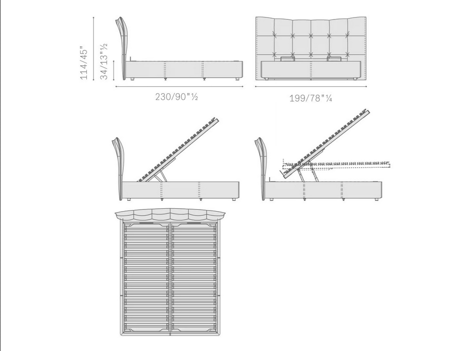 Il letto incorpora meccanismi avanzati per facilità d'uso, come il sistema di sollevamento a molla a gas per il compartimento di stoccaggio. Questa innovazione garantisce un funzionamento fluido e un accesso sicuro allo stoccaggio nascosto, rendendolo un'aggiunta pratica a qualsiasi camera da letto moderna. L'attenzione al design ergonomico e alle caratteristiche user-friendly migliora l'esperienza complessiva di utilizzo del letto.