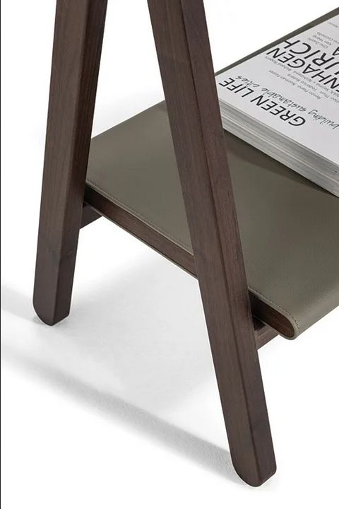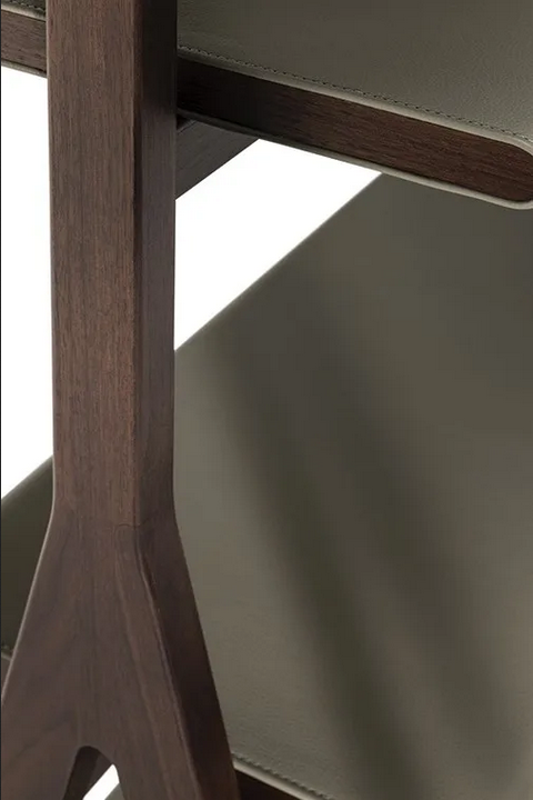 Realizzata in pregiato compensato di betulla e adornata con pelle di cavallo, la libreria presenta un impiallacciatura in noce Canaletto sui lati. I materiali utilizzati sono sostenibili ed ecologici, conformi agli standard internazionali per qualità e sicurezza. La finitura in pelle fornisce un tocco di lusso, mentre i ganci in metallo con finitura in ottone naturale garantiscono durabilità. Tecniche artigianali sono impiegate nella sua produzione, evidenziando l'artigianato associato a Poltrona Frau.