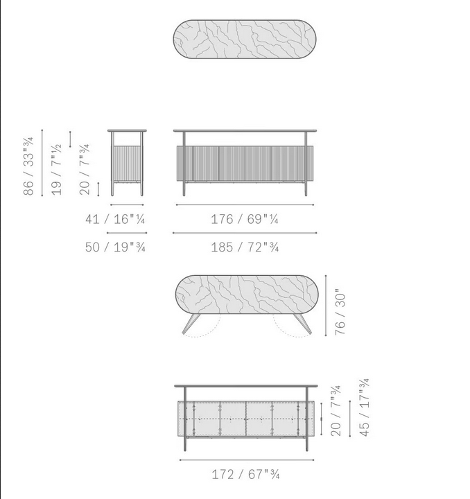 Il Sideboard è disponibile in più configurazioni per adattarsi a diversi spazi e preferenze. L'armadio alto raggiunge un'altezza impressionante, perfetto per esporre oggetti decorativi, mentre l'armadio basso offre una soluzione più compatta per spazi più piccoli. Ogni pezzo è progettato con dimensioni che prioritizzano sia l'appeal estetico che lo stoccaggio funzionale, garantendo che si adattino perfettamente a vari layout e stili di interni.