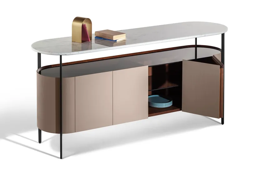 La collezione Mi presenta soluzioni tecnologiche innovative, come mensole regolabili che possono essere posizionate per adattarsi a vari oggetti. I sideboard utilizzano cerniere di alta qualità per un'apertura e chiusura fluida, garantendo un'esperienza utente senza soluzione di continuità. Inoltre, l'incorporazione di materiali durevoli come vetro temperato e noce Canaletto migliora la funzionalità e la longevità dei mobili, rendendoli adatti all'uso quotidiano.