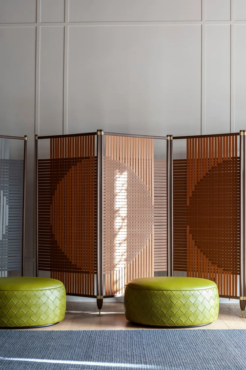 Il paravento in pelle PLOT di Poltrona Frau è un'aggiunta straordinaria agli interni moderni, che combina eleganza e funzionalità. Progettato da GamFratesi, questo divisorio modulare consente una ridefinizione creativa dello spazio in qualsiasi stanza. I suoi unici motivi geometrici realizzati in pelle intrecciata non solo migliorano l'appeal estetico, ma garantiscono anche privacy. Disponibile in più configurazioni, trasforma qualsiasi angolo in un'area chic e sofisticata, rendendolo una scelta perfetta per spazi residenziali e commerciali.