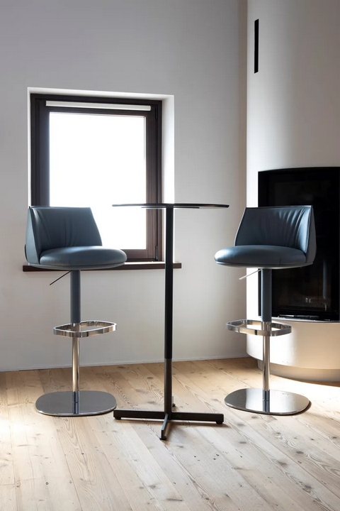 Lo sgabello in pelle alta è un pezzo autonomo che può essere abbinato a vari tavoli e banconi. Il suo design elegante e l'altezza regolabile lo rendono un'aggiunta versatile a qualsiasi area pranzo o cucina, fornendo una soluzione di seduta elegante che completa una gamma di stili.