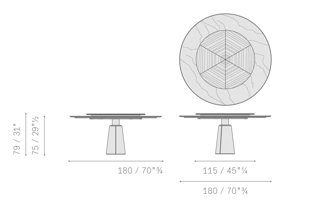 Il design del tavolo MESA DUE enfatizza l'attenzione ai dettagli, dalle linee eleganti del piano circolare alla robusta base conica. L'integrazione di un Lazy Susan aggiunge funzionalità migliorando al contempo l'appeal estetico del tavolo. La cura artigianale è evidente negli elementi decorativi e nelle finiture precise, garantendo un pezzo visivamente straordinario che completa qualsiasi ambiente da pranzo moderno.