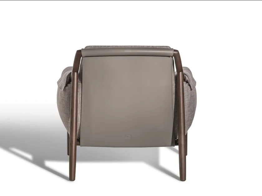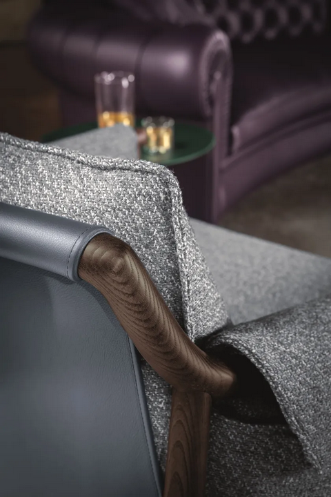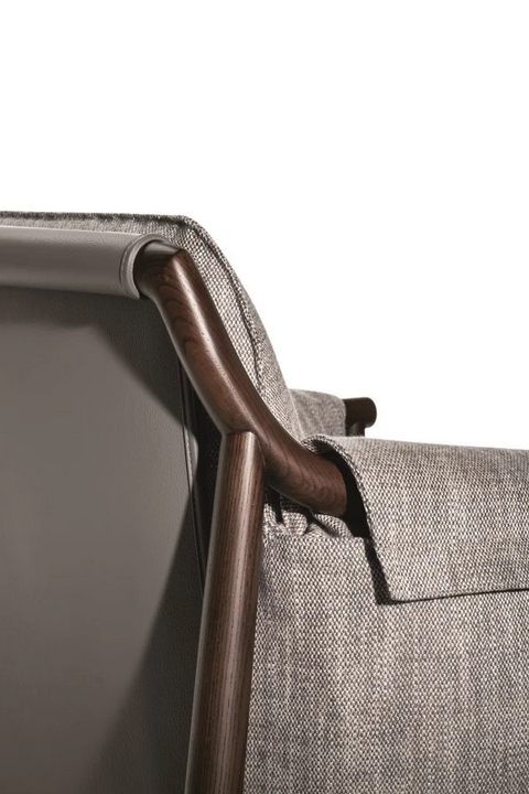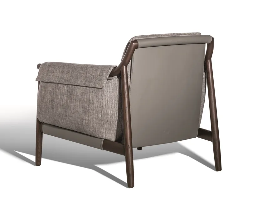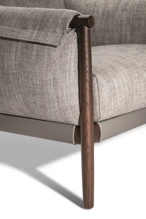 La poltrona presenta una forma morbida e accogliente che avvolge chi si siede in comfort. La sua imbottitura lussuosa e i dettagli di cucitura raffinati evidenziano la meticolosa artigianalità impiegata in ogni pezzo. L'unica integrazione di grandi fasce di pelle nella struttura ne migliora l'appeal visivo mentre fornisce supporto funzionale. L'estetica complessiva è caratterizzata da un'integrazione perfetta di forma e funzione, rendendola un punto focale accattivante in qualsiasi stanza.