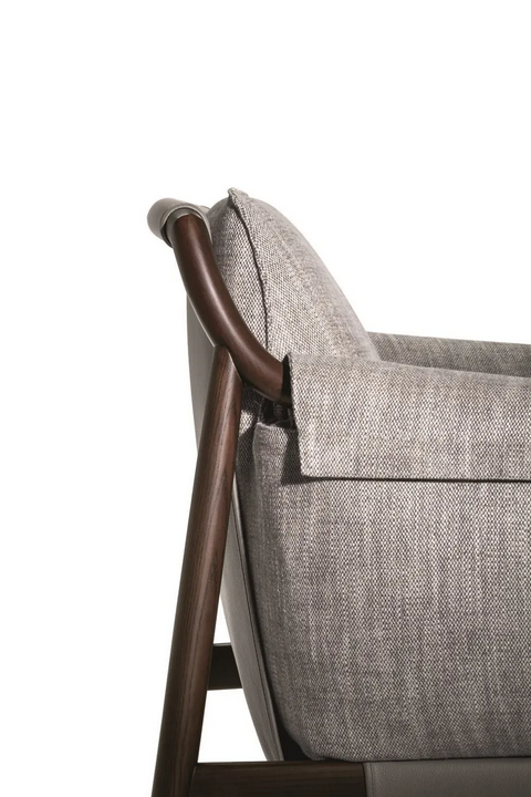 La poltrona è dotata di un sistema di supporto sofisticato che include un tessuto tecnico sotto il sedile, fungendo da molla per un comfort migliorato. I cuscini sono riempiti con una combinazione di schiuma poliuretanica e ovatta di poliestere, offrendo un'esperienza di seduta morbida. Ogni cuscino è fissato con cerniere nascoste, garantendo un aspetto elegante mentre facilita la rimozione per la pulizia o la sostituzione.