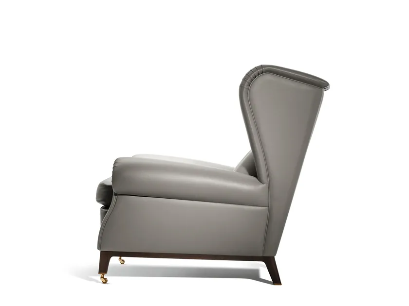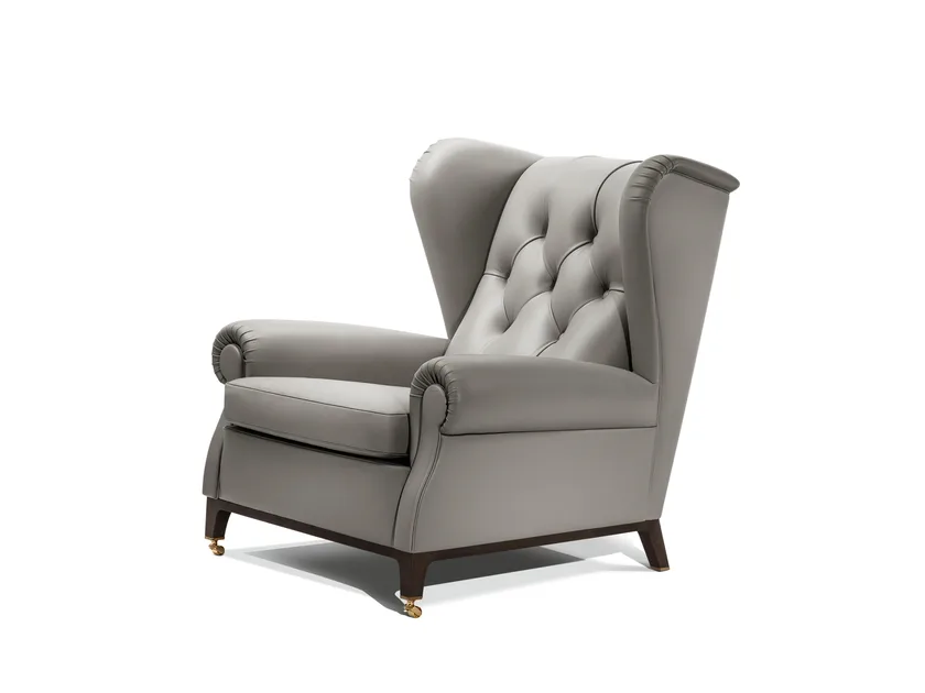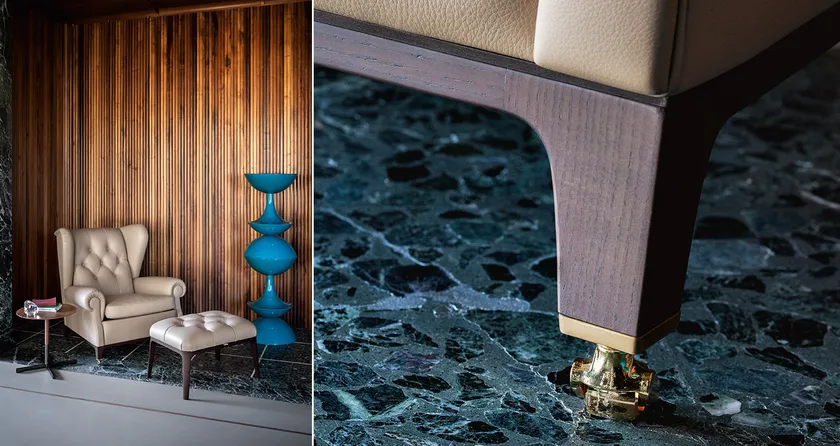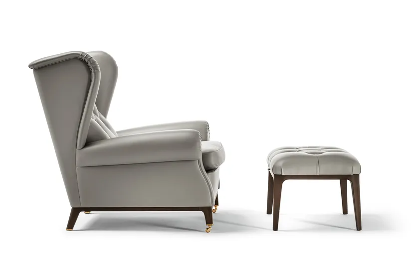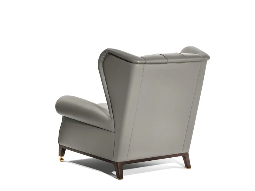 Realizzata in faggio massello stagionato e rivestita in pelle Pelle Frau®, la poltrona dimostra un impegno per la qualità e la sostenibilità. Il rivestimento presenta dettagli capitonné cuciti a mano che aggiungono un tocco di eleganza. L'imbottitura include crine di cavallo gommoso per durabilità e comfort, mentre il cuscino del sedile è riempito con piume d'oca, garantendo un'esperienza di seduta lussuosa. Le finiture includono un telaio in frassino massello tinto Moka e opzioni di cappucci metallici in oro o grigio antracite, riflettendo sofisticazione e artigianato.