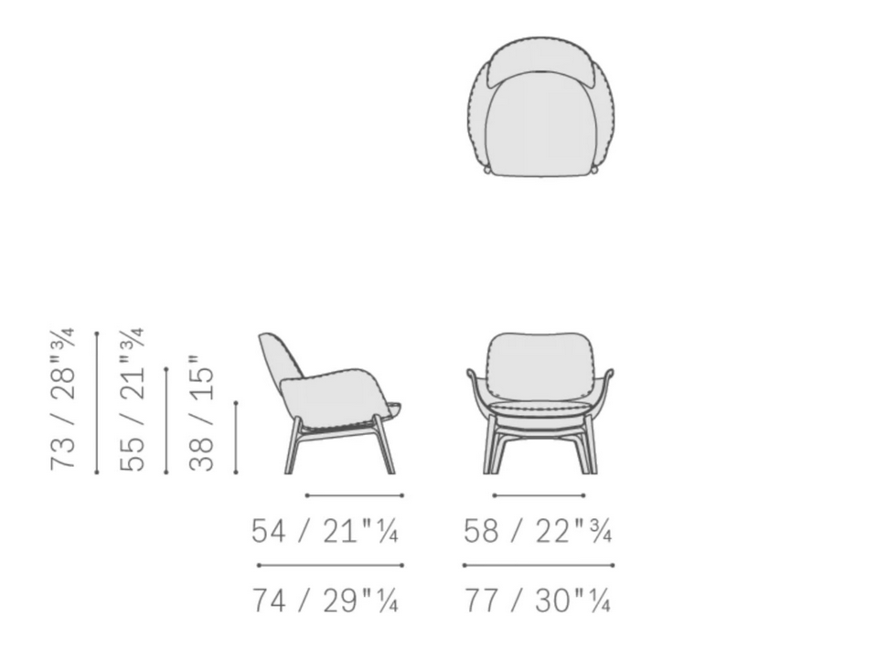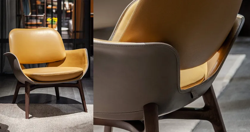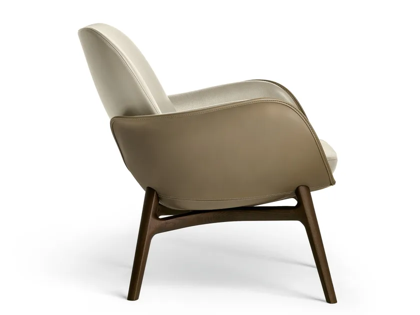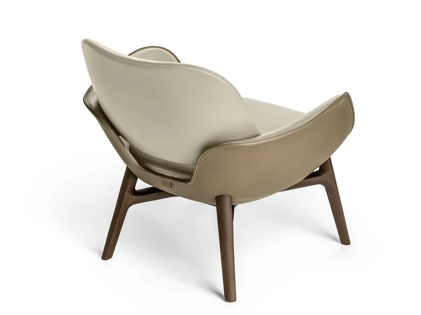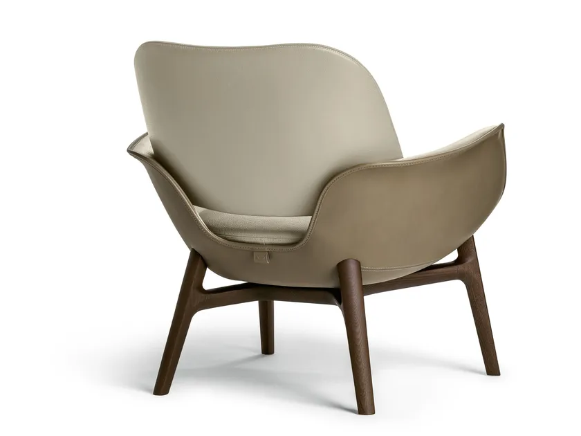 La poltrona presenta dettagli di design accurati, come lo schienale leggermente imbottito che sembra galleggiare, conferendo un'aria di leggerezza al pezzo. La cucitura a contrasto visibile mette in evidenza la meticolosa artigianalità coinvolta nella sua creazione. Le curve dinamiche e il profilo aperto della poltrona attirano lo sguardo e invitano al relax, rendendola un pezzo distintivo in qualsiasi stanza.