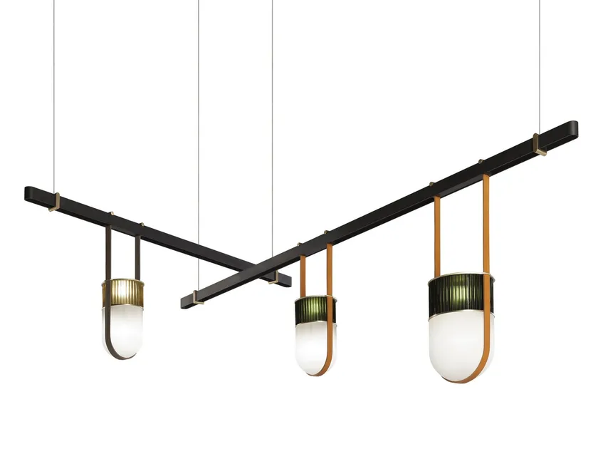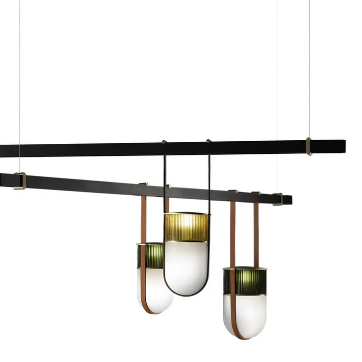 Il design della lampada a sospensione XI incarna un'estetica moderna con un richiamo all'artigianato tradizionale. Le sue linee pulite e le forme eleganti creano un impatto visivo notevole, rendendola un punto focale in qualsiasi stanza. La fusione di vetro soffiato e pelle riflette un approccio minimalista, celebrando nel contempo le tecniche artigianali, risultando in un pezzo senza tempo che si integra perfettamente in diversi stili d'interni.