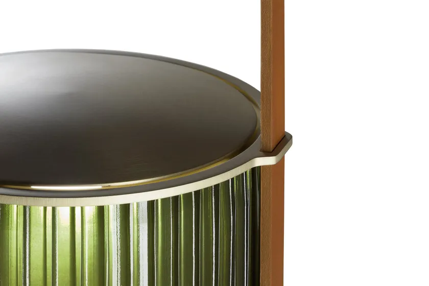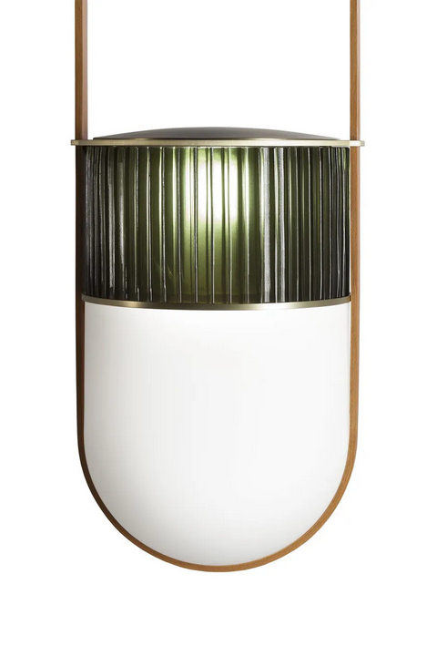 Realizzata in vetro soffiato di alta qualità e pregiata pelle Cuoio Saddle Extra, questa lampada mostra un'eccezionale fusione di materiali. Lo strato esterno in vetro presenta una superficie testurizzata e trasparente, disponibile in colori come ambra, smeraldo, zaffiro e pietra di luna. Il pezzo interno è bianco con una finitura perlacea, creando un bagliore caldo. I componenti metallici sono rifiniti in ottone spazzolato, aggiungendo un tocco di sofisticatezza. Tutti i materiali utilizzati sono ecologici e certificati secondo standard internazionali, garantendo sostenibilità senza compromettere lo stile.