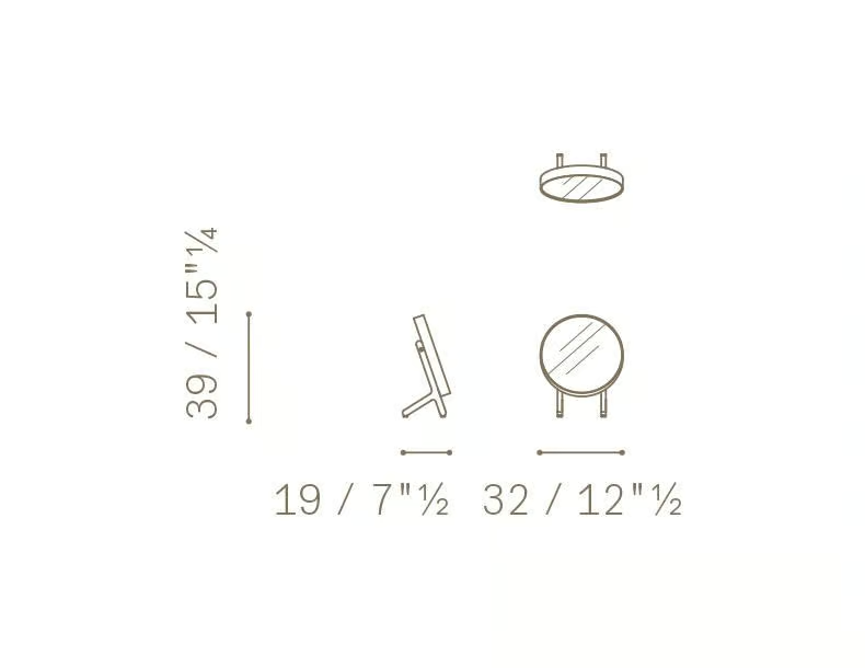 Lo specchio da tavolo REN è progettato in una dimensione standard, con un diametro rotondo di 310 mm. Questa dimensione è ideale per l'uso su tavoli, rendendolo adatto a varie superfici, da comò a scrivanie. Le proporzioni eleganti garantiscono che non occupi spazio eccessivo pur servendo efficacemente al suo scopo.