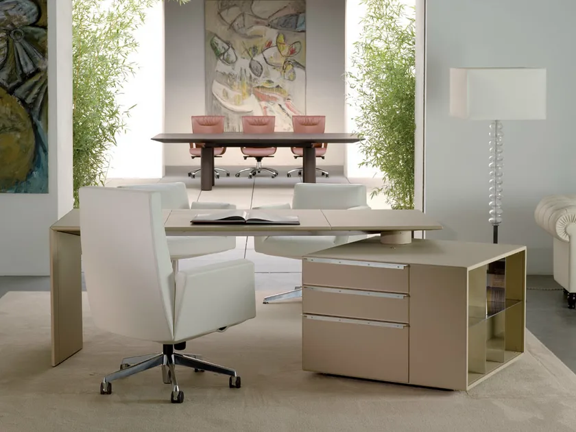 L'appeal estetico del C.E.O. CUBE DESK risiede nel suo design accurato. I pannelli sovrapposti con bordi affusolati aggiungono profondità e sofisticazione, mentre le gambe in metallo cilindriche forniscono stabilità e stile. L'attenzione ai dettagli è evidente nelle opzioni di rivestimento per l' 'Area Presidenziale', consentendo personalizzazioni di colore per soddisfare le preferenze individuali. L'aspetto complessivo è raffinato e professionale, rendendolo perfetto per ambienti esecutivi.
