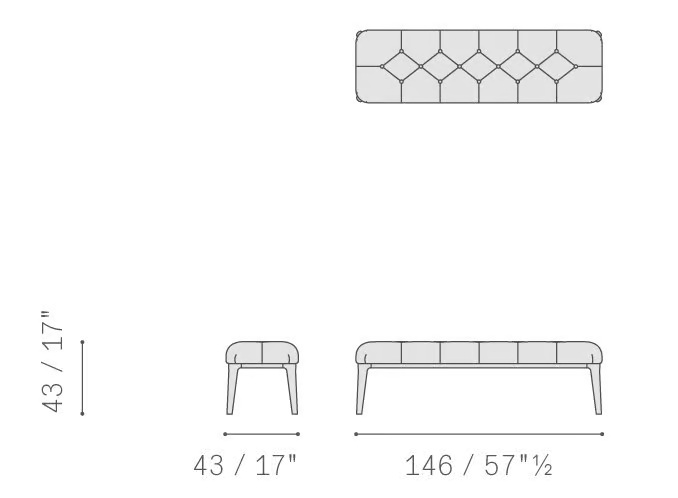 La panca è progettata con un robusto telaio in compensato di betulla e una base in frassino massiccio, garantendo longevità e stabilità. Il sistema a cinghia elastica migliora il comfort di seduta, rendendola adatta per un uso prolungato. Ogni componente è realizzato con precisione, riflettendo gli elevati standard del marchio Poltrona Frau.