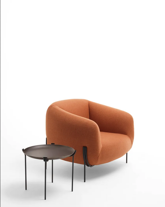 cromo nero, ottone satinato e rame lucido. Questo pezzo si completa perfettamente con la poltrona Geo e il divano piccolo, rendendolo un accessorio ideale sia per incontri informali che per ambienti raffinati.