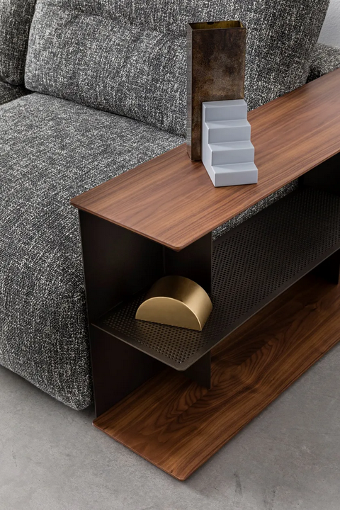 Il divano MY TAOS presenta dettagli di design ben pensati, come cuscini di supporto cilindrici e tavolini laterali estraibili, migliorando sia la funzionalità che l'estetica. La forma arrotondata complessiva ammorbidisce l'impatto visivo, rendendolo un perfetto pezzo centrale per i soggiorni. Gli elementi decorativi sono sottili ma impattanti, contribuendo a un'atmosfera sofisticata che attira l'attenzione.