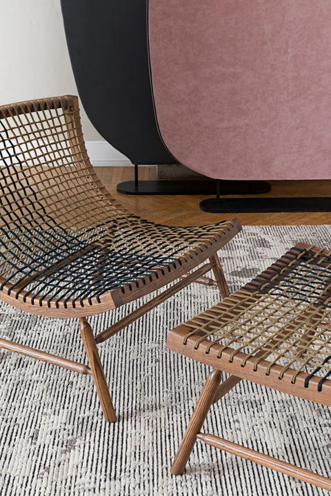 Anche se il poggiapiedi Sitar è un pezzo semplice ma elegante, incorpora principi di design innovativi che danno priorità al comfort e all'estetica. L'uso di materiali di alta qualità garantisce durata, mentre il design pensato consente una facile manutenzione. La combinazione di legno e corde esemplifica un approccio moderno al design dei mobili, unendo stile e praticità.