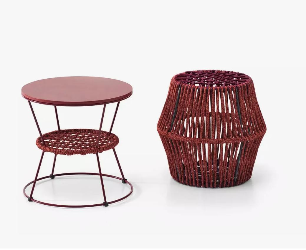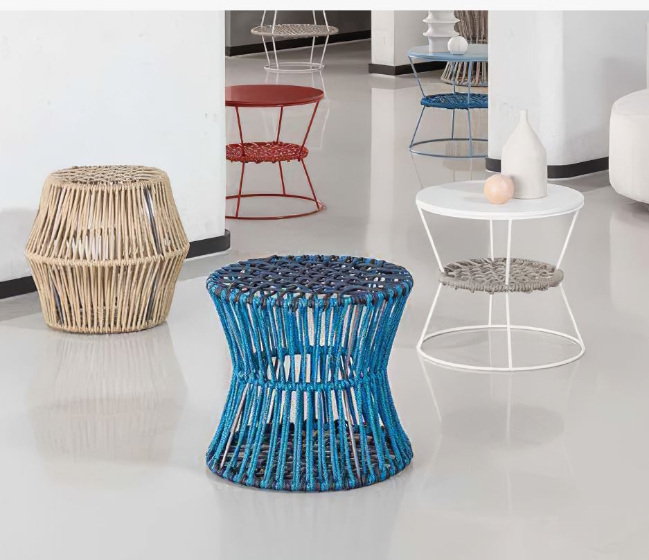 Questo pouf è costruito utilizzando materiali ecologici, tra cui una robusta struttura in filo rivestito con un diametro di 8 mm e una particolare intrecciatura di corde di poliestere da 6 mm. La finitura assicura che i materiali siano adatti per l'uso all'aperto, offrendo longevità e resistenza agli agenti atmosferici. La superficie superiore presenta MDF con una finitura laccata, fornendo un aspetto elegante e stiloso pur mantenendo la durata per ambienti esterni. Tutti i materiali sono certificati secondo gli standard internazionali, garantendo sostenibilità e qualità.