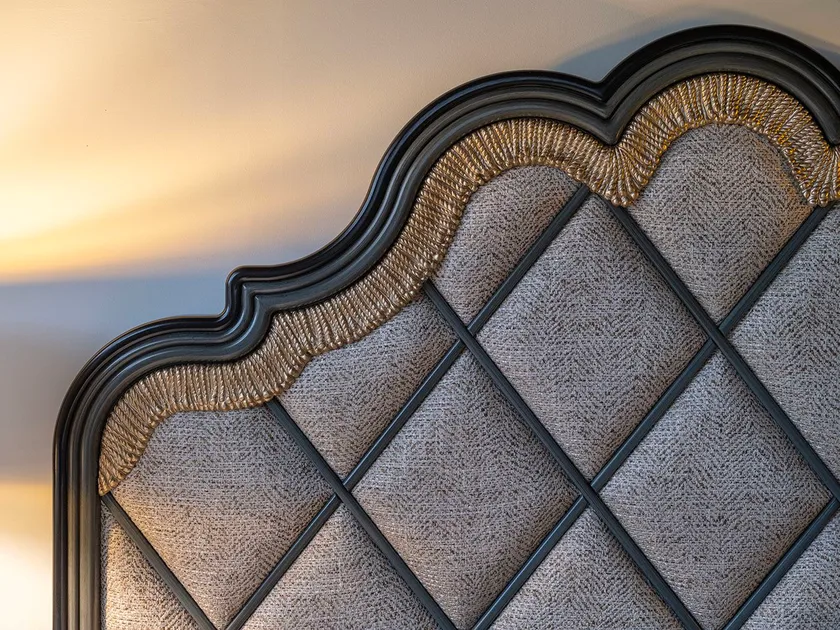 Il design del letto enfatizza dettagli eleganti, come le squisite frange intagliate e l'imbottitura a forma di diamante. Questi elementi decorativi contribuiscono all'impatto visivo complessivo, rendendo il letto un pezzo distintivo in qualsiasi stanza. L'attenzione meticolosa ai dettagli sia nella testiera che nel telaio del letto assicura che questo pezzo di arredamento non sia solo funzionale ma anche un'opera d'arte.