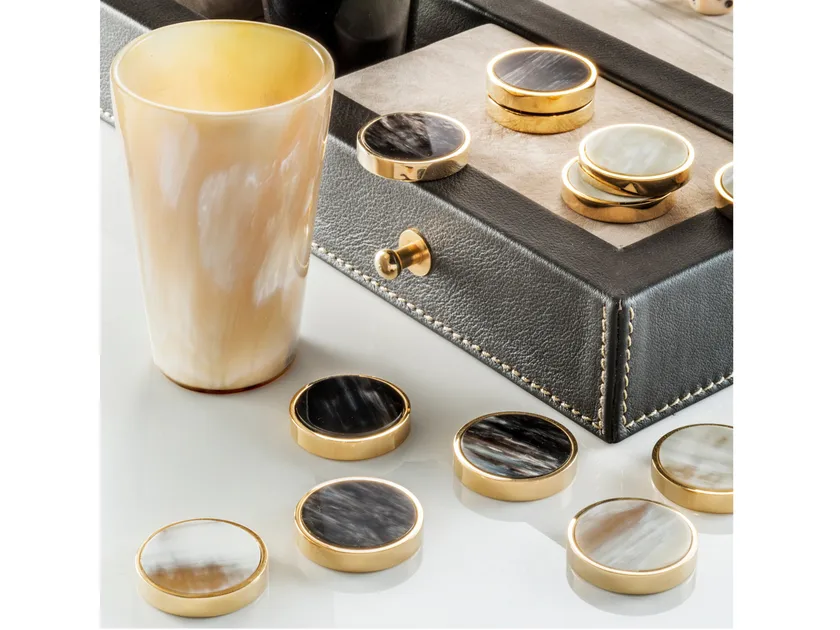 Questo set di backgammon incarna uno stile moderno, fondendo l'eleganza classica con elementi di design contemporaneo. La combinazione unica di artigianato tradizionale e estetiche moderne crea un pezzo visivamente accattivante. L'attenzione ai dettagli, dagli inserti in corno agli accenti in bronzo satinato, riflette un impegno per stile e sofisticatezza che attrae i clienti più esigenti.