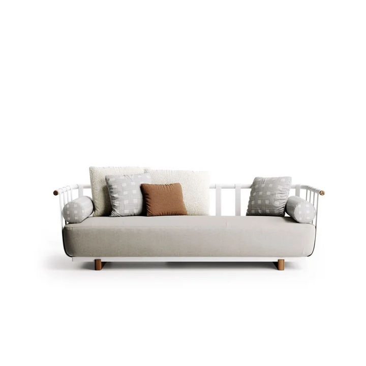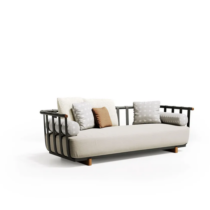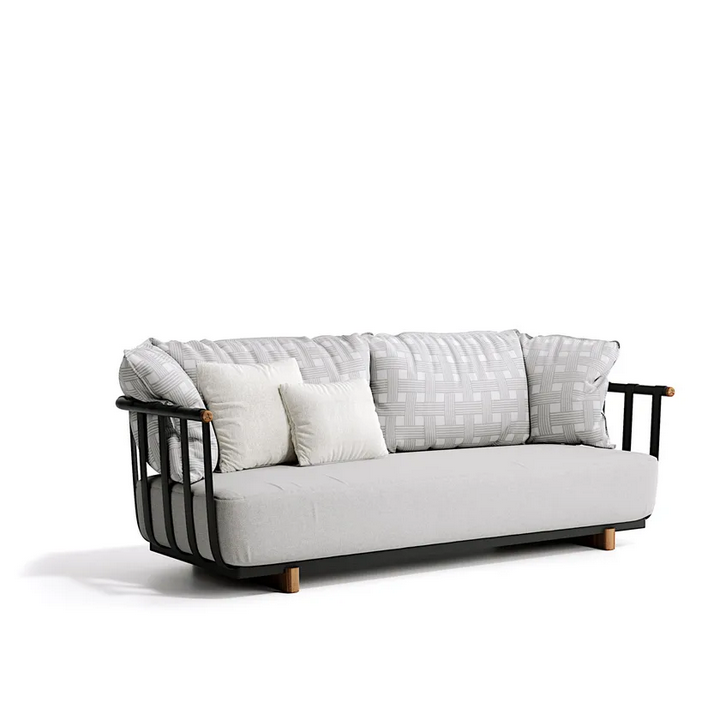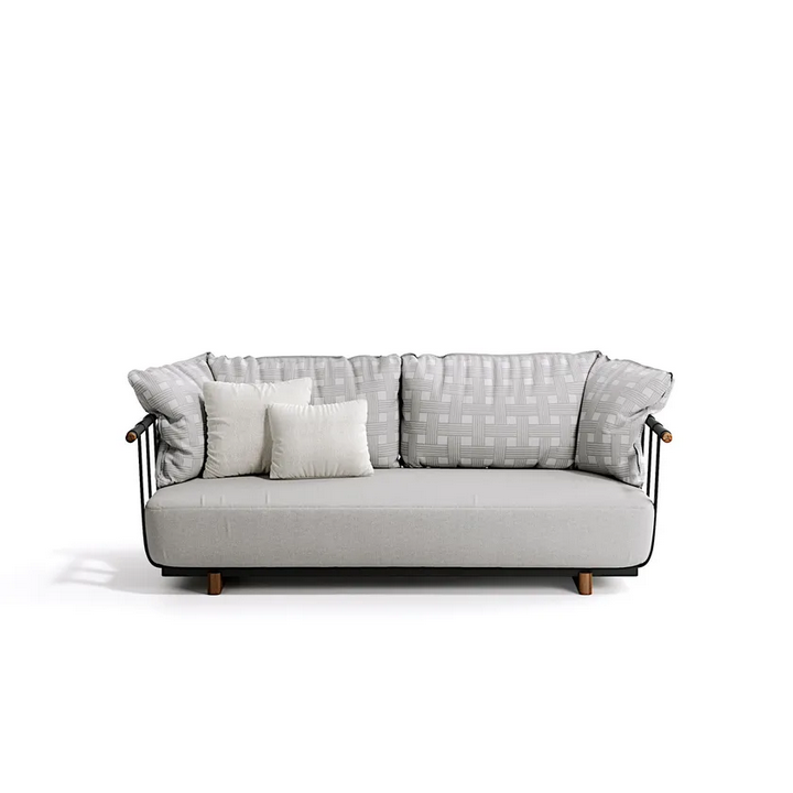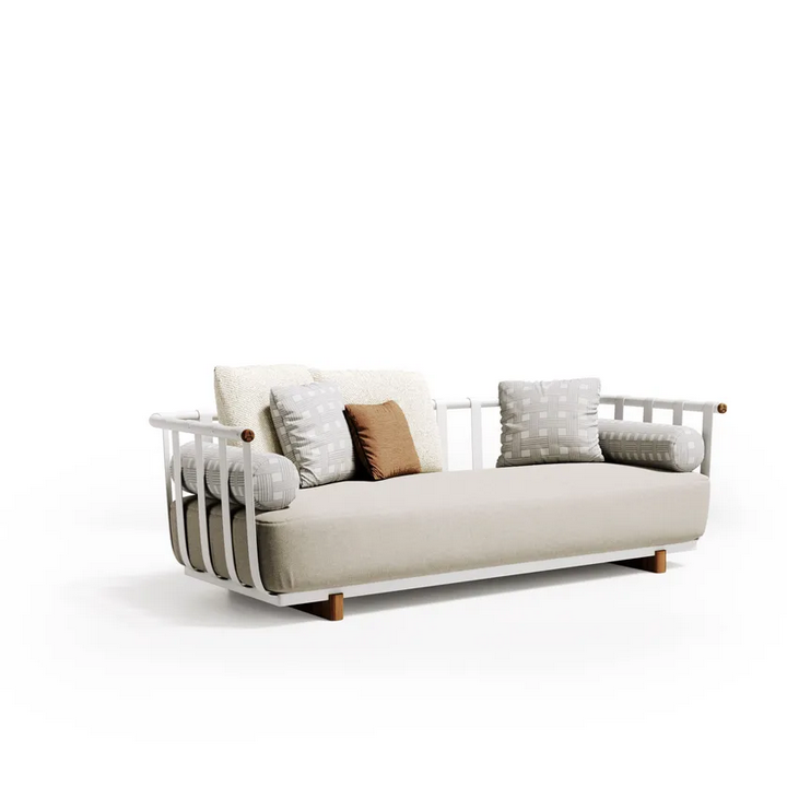 Realizzato con materiali di alta qualità, il divano Portofino presenta una robusta struttura in alluminio che garantisce longevità e stabilità. I dettagli in teak naturale aggiungono un tocco caldo, migliorando l'appeal visivo complessivo. L'imbottitura in tessuto è progettata per l'uso all'aperto, offrendo durata pur rimanendo morbida al tatto. La finitura è applicata con meticolosità, mostrando un equilibrio tra superfici opache e lucide che conferiscono sofisticatezza al pezzo. Tutti i materiali utilizzati sono ecologici e certificati secondo standard internazionali, garantendo sostenibilità senza compromettere lo stile.