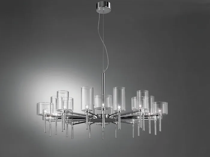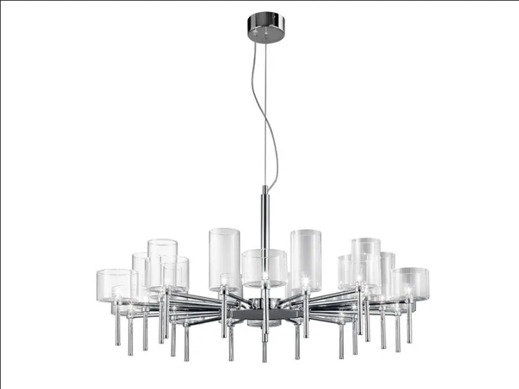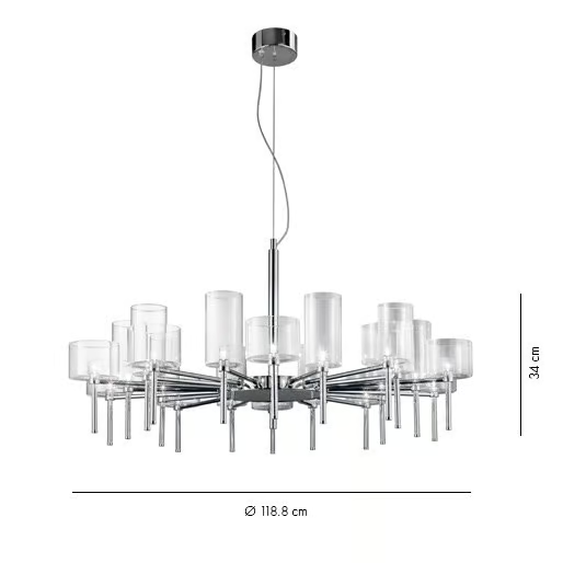 Questo squisito lampadario è costruito in vetro e metallo di alta qualità, garantendo durata e longevità. La finitura cromata aggiunge un aspetto elegante e lucido, migliorando il design complessivo. I materiali utilizzati sono ecologici e sostenibili, certificati per soddisfare gli standard internazionali, rendendolo una scelta responsabile per i consumatori attenti all'ambiente. La tonalità di vetro è disponibile in trasparente, rosso e grigio, consentendo personalizzazioni per abbinarsi a qualsiasi interno.