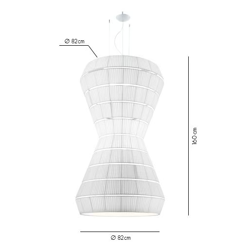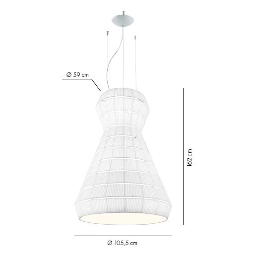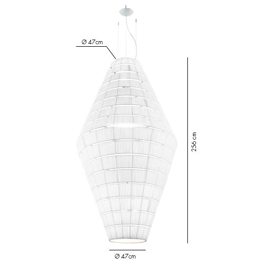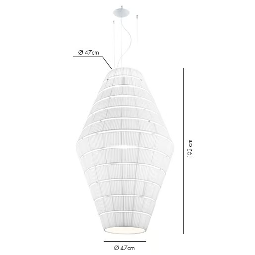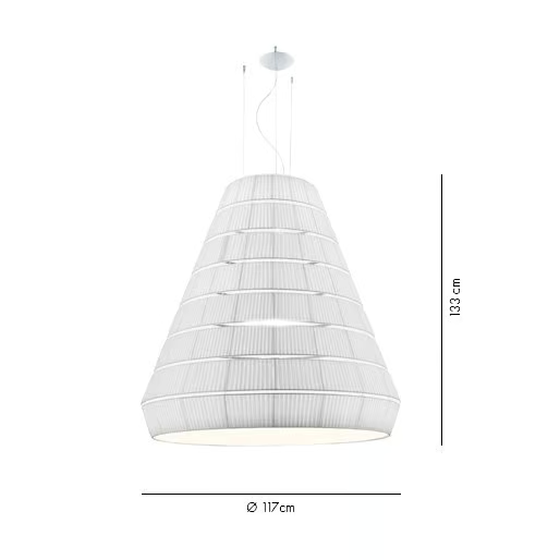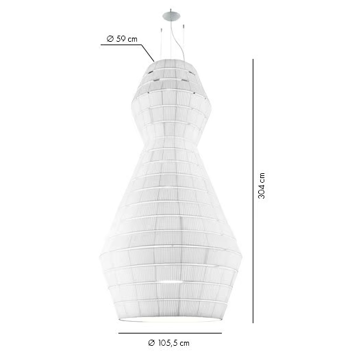 La lampada è progettata per ospitare una fonte di luce E27, fornendo opzioni per vari tipi di lampadine. Le sue dimensioni variano da un diametro di 93 cm a un impressionante 300 cm, con lunghezze del paralume che raggiungono fino a 290 cm. Questa gamma consente una notevole versatilità nell'installazione e nel design, rendendola adatta per spazi ampi o ambienti intimi. Il design tecnico garantisce facilità di installazione e compatibilità con i sistemi elettrici standard.
