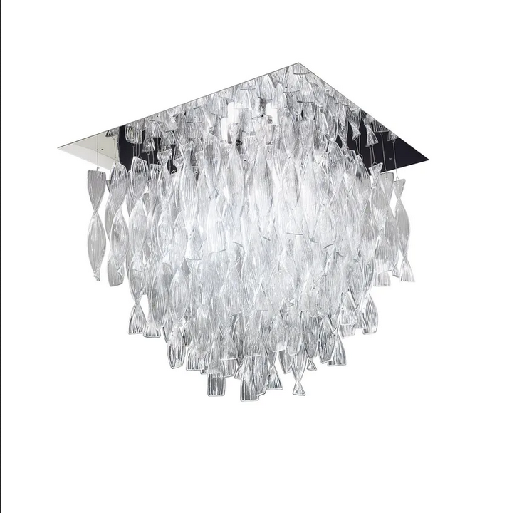 Realizzata in vetro e acciaio di alta qualità, la lampada da soffitto in vetro di Murano garantisce durata e appeal estetico. Il vetro di Murano è rinomato per la sua chiarezza e brillantezza, mentre il canopy in acciaio lucido aggiunge un tocco contemporaneo. La finitura della lampada è accuratamente lucidata per esaltare la sua eleganza, assicurando che non solo illumini, ma serva anche come un pezzo decorativo straordinario. Tutti i materiali utilizzati sono ecologici e conformi agli standard internazionali per la sostenibilità.