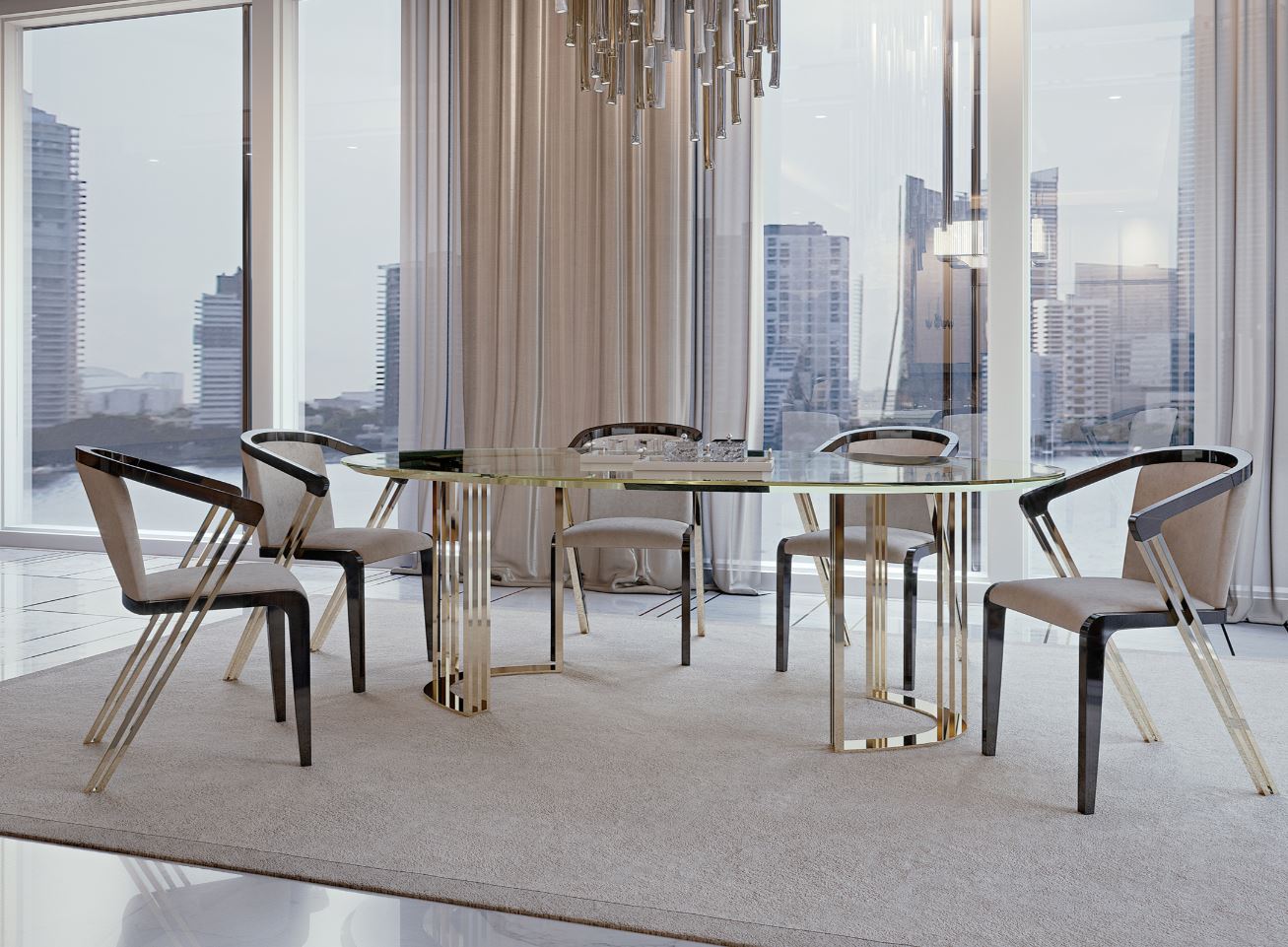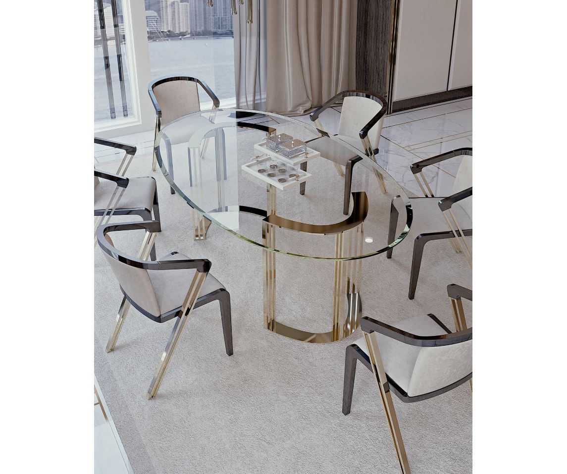 Realizzato in vetro di alta qualità e metallo durevole, questo tavolo da pranzo esemplifica lusso e modernità. La superficie in vetro trasparente offre un senso di apertura, mentre gli accenti in metallo offrono stabilità e un contrasto accattivante. La finitura è meticolosa, con una superficie lucida che riflette splendidamente la luce, garantendo una facile manutenzione. Tutti i materiali sono ecologici e conformi agli standard internazionali di sostenibilità, promuovendo uno stile di vita più verde senza compromettere lo stile.