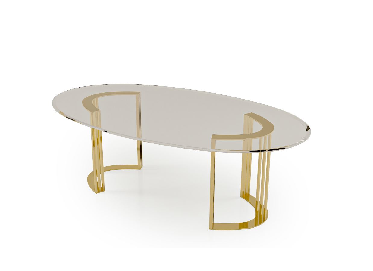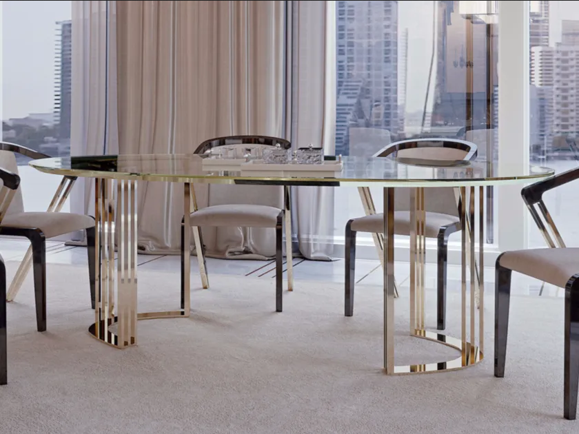 Il design del Tavolo da pranzo ovale in vetro è caratterizzato dalle sue curve eleganti e dalla precisione geometrica. Le linee morbide e i bordi arrotondati creano una sensazione di fluidità, mentre gli inserti in metallo aggiungono un tocco artistico. L'attenzione ai dettagli è evidente nell'artigianato, con elementi decorativi che migliorano il suo fascino estetico. Questo focus su forma e funzione risulta in un pezzo visivamente accattivante che attira l'attenzione e innalza l'esperienza gastronomica.