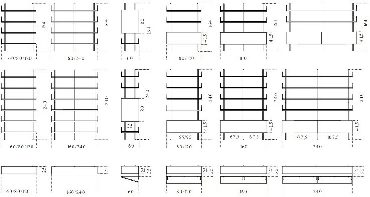 Il sistema di scaffalature Brera 23 è disponibile in varie dimensioni e configurazioni per soddisfare spazi e requisiti diversi. Ogni unità è progettata con particolare attenzione alle dimensioni, garantendo che si adatti perfettamente all'interno degli ambienti cucina standard, fornendo ampie opzioni di stoccaggio e esposizione. La versatilità del sistema consente sia installazioni piccole che grandi, soddisfacendo una vasta gamma di preferenze di design.