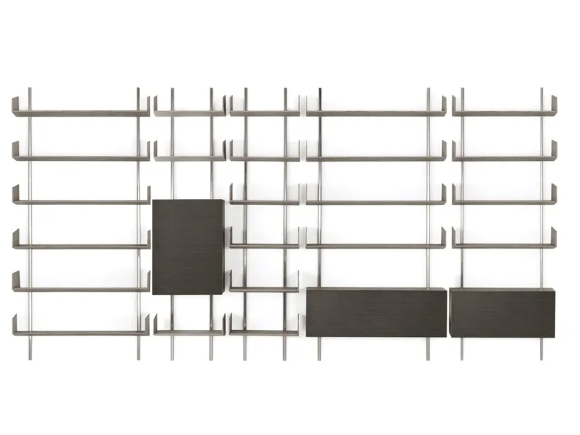 Il sistema di scaffalature Brera 23 è composto da più componenti, inclusi supporti verticali e varie unità di ripiano. Questo design modulare consente personalizzazione e flessibilità nel layout, permettendo agli utenti di adattare il sistema di scaffalature alle proprie esigenze e preferenze specifiche.