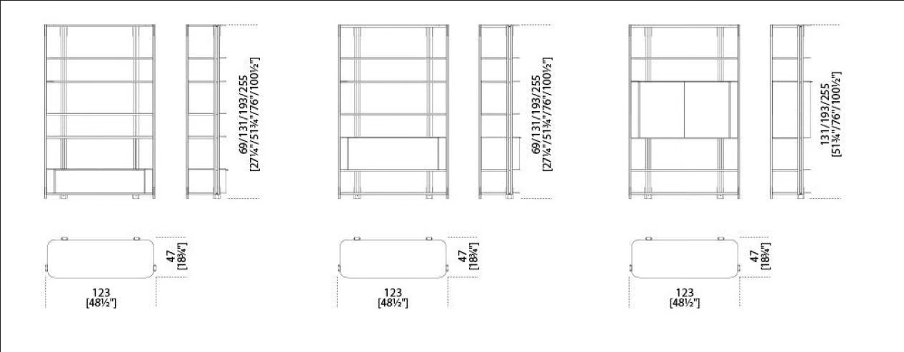 La libreria SYIL è disponibile in varie dimensioni e configurazioni per soddisfare diverse esigenze di spazio. Ogni unità è progettata per fornire un'archiviazione ottimale mantenendo un profilo elegante. Le dimensioni sono attentamente considerate per garantire compatibilità con gli spazi abitativi contemporanei, rendendola una scelta versatile per qualsiasi casa.