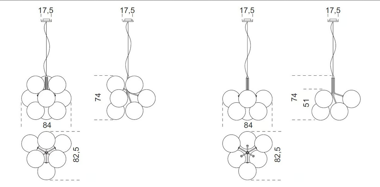 La lampada Bolle Cielo è progettata con una funzione di altezza personalizzabile, consentendo di adattarsi a diverse altezze dei soffitti. Le dimensioni delle sfere di vetro e la struttura complessiva sono progettate con cura per creare un impatto visivo equilibrato. Questa lampada è una scelta ideale per spazi che richiedono sia funzionalità che fascino estetico, soddisfacendo diverse preferenze di design e dimensioni delle stanze.