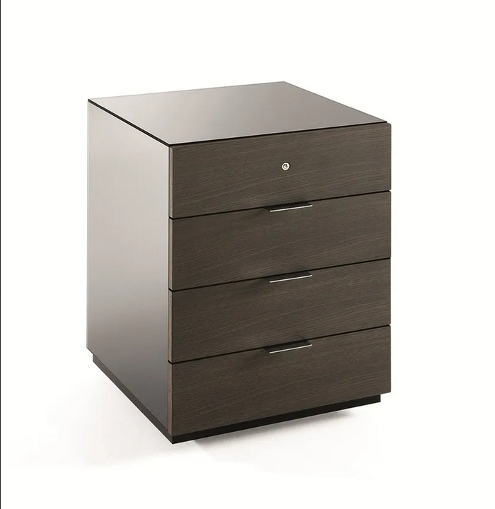 L'unità di cassetti presenta una silhouette elegante e dettagli sofisticati, tra cui maniglie cromate che aggiungono un tocco di eleganza. L'interazione tra le superfici riflettenti e le finiture in legno opaco crea un contrasto visivamente attraente, mentre il design attento assicura che l'unità non sia solo funzionale, ma anche un pezzo di dichiarazione in qualsiasi spazio di lavoro.