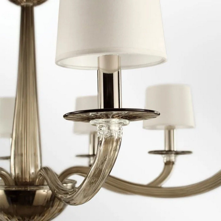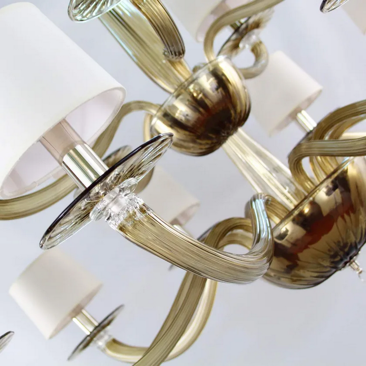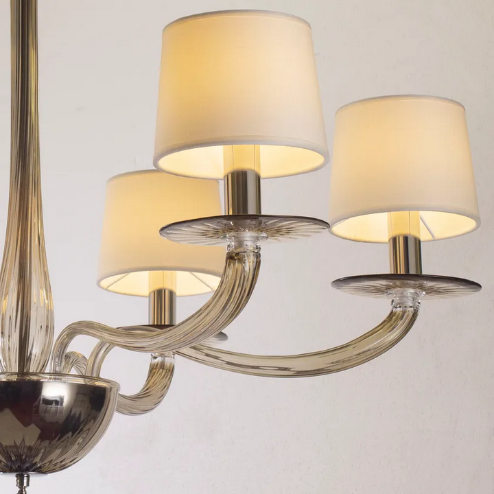 Realizzato in vetro di Murano di alta qualità e raffinati paralumi in cotone, il lampadario in vetro di Murano Serenade garantisce durabilità mantenendo un aspetto lussuoso. Il lampadario presenta un processo di finitura meticoloso che mette in risalto l'eleganza del vetro e la morbidezza del cotone. Tutti i materiali utilizzati sono ecologici e conformi agli standard internazionali, garantendo sostenibilità senza compromettere lo stile.