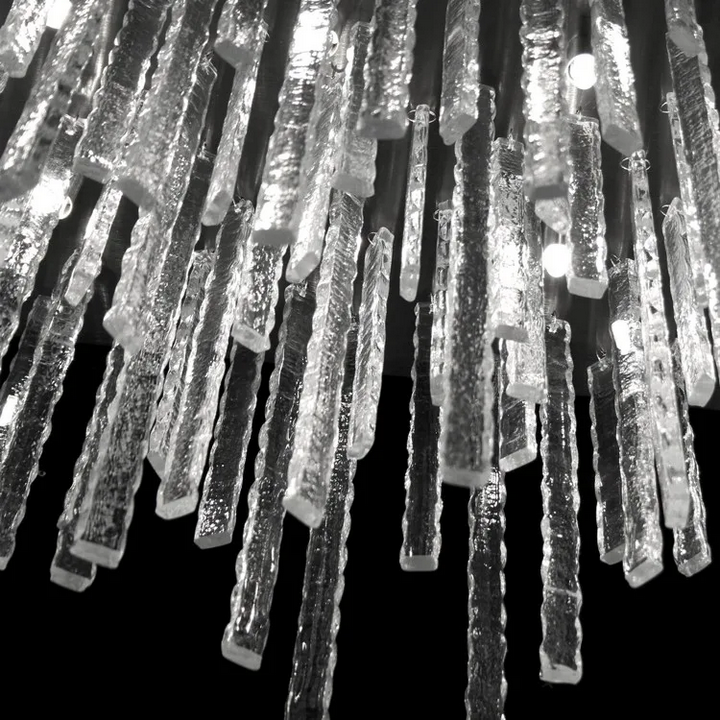 Il POLARIS Ceiling Light presenta linee pulite e una silhouette elegante, accentuata dai dettagli in vetro artistico. I bordi irregolari dei listelli di vetro evocano forme naturali, come stalattiti, aggiungendo un tocco organico al design. L'attenzione ai dettagli sia nei componenti in vetro che in quelli in metallo risulta in un apparecchio di illuminazione sofisticato ed elegante che eleva l'atmosfera di qualsiasi spazio.