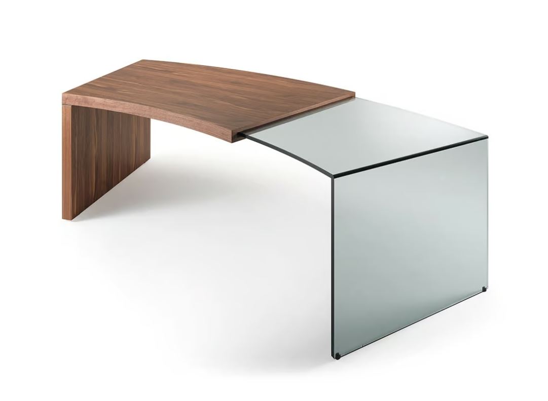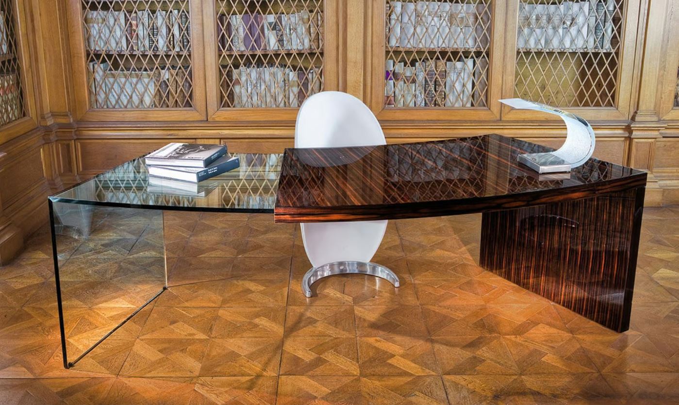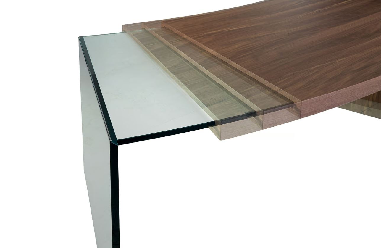 Scrivania con lunghezza regolabile. La struttura è in vetro, legno massello. Possibile tappezzeria in pelle