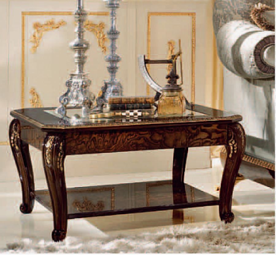 Lo stand quadrato in stile classico, su gambe strette, decorato con elementi intagliati, è presentato dalla fabbrica A. R. ARREDAMENTI SRL della collezione AMADEUS. Il supporto è dotato di un piano di lavoro in vetro e di un ripiano inferiore. Realizzato in legno massello naturale e decorato con sculture artistiche fatte a mano