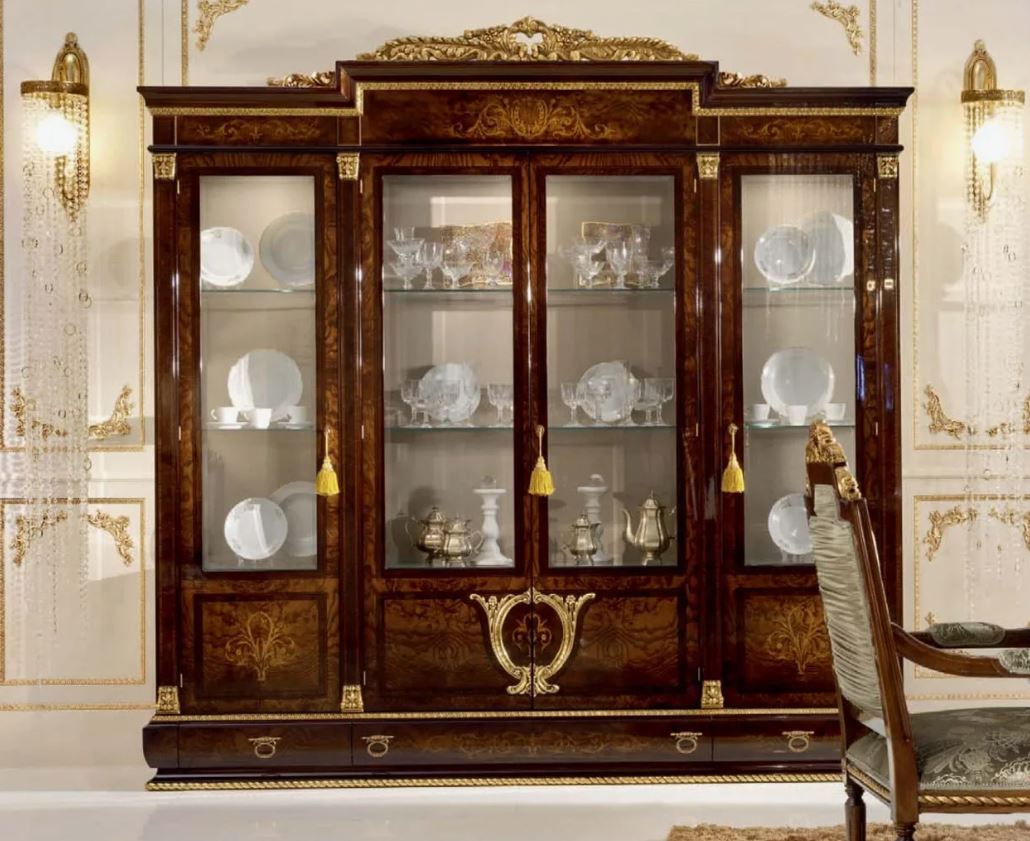 La libreria a quattro porte in stile classico è presentata dalla fabbrica italiana A. R. ARREDAMENTI SRL nella collezione AMADEUS. Le porte dell'armadio sono realizzate con l'aggiunta di vetro, la parete posteriore è rivestita in tessuto. L'armadio è dotato di tre cassetti, realizzato in legno massello naturale. Decorato con intarsi e intagli artistici fatti a mano a forma di riccioli