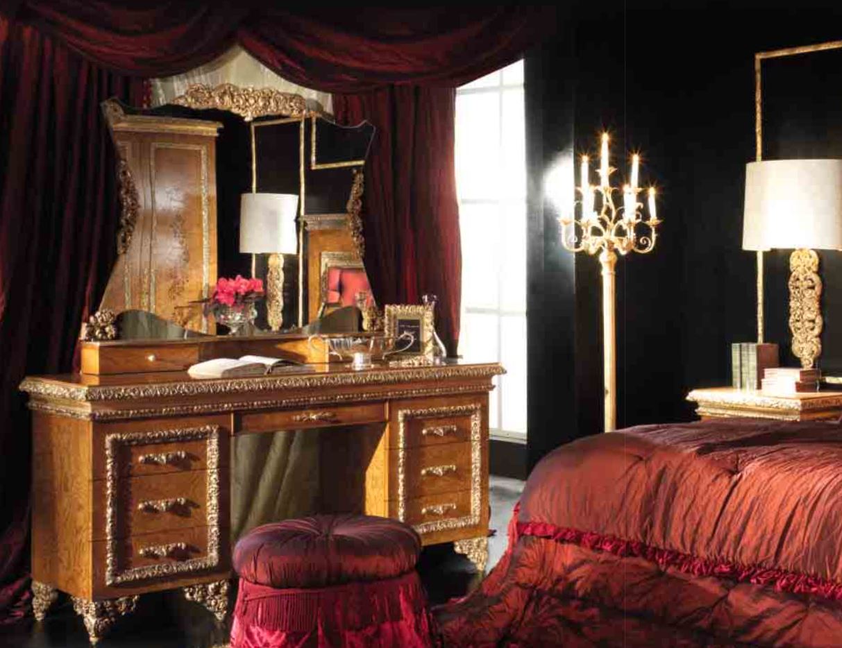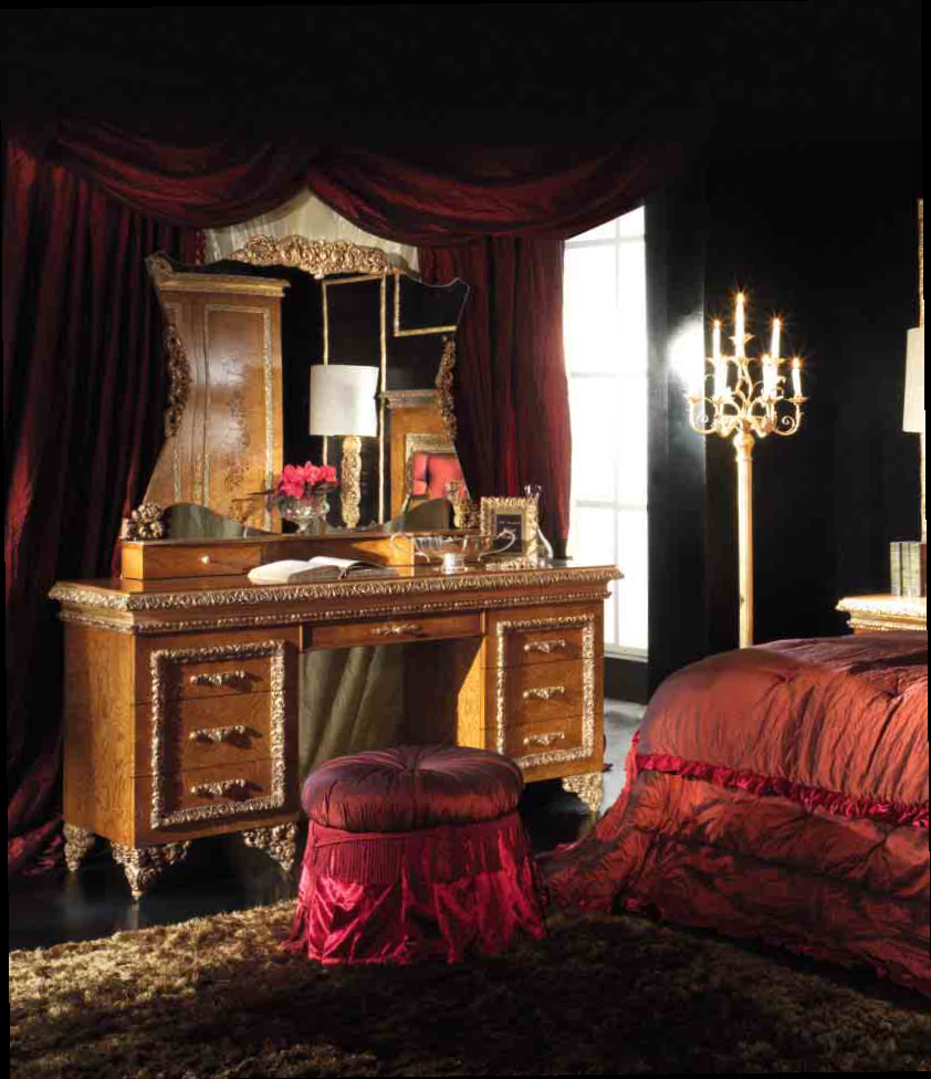 La toletta, realizzata in stile classico, è presentata dalla fabbrica A. R. ARREDAMENTI SRL nella collezione ROYAL COLLECTION. Le gambe del tavolo, sapientemente decorate con sculture artistiche fatte a mano, si fondono armoniosamente con l'elegante finitura del bordo del piano di lavoro. Il tavolo è dotato di sette cassetti, realizzato in legno massello naturale