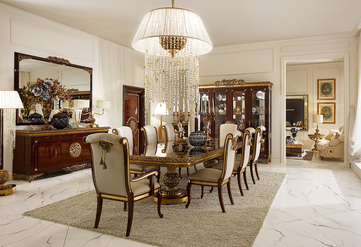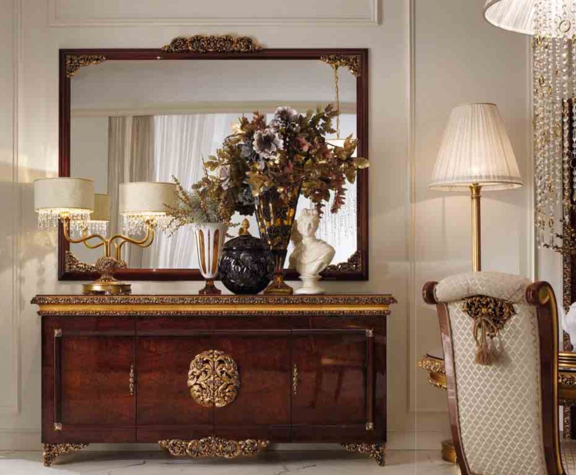 Realizzato in stile classico, il comò a quattro porte sulle gambe scolpite è presentato dalla fabbrica A. R. ARREDAMENTI SRL nella collezione GRAND ROYAL. Realizzato in legno massello naturale e decorato con arte intagliato a mano
