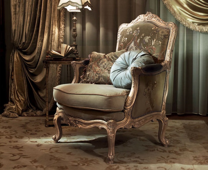 Poltrona. Riempimento-poliuretano. Decorato con elementi intagliati. Sono possibili altre varianti di tappezzeria e finiture