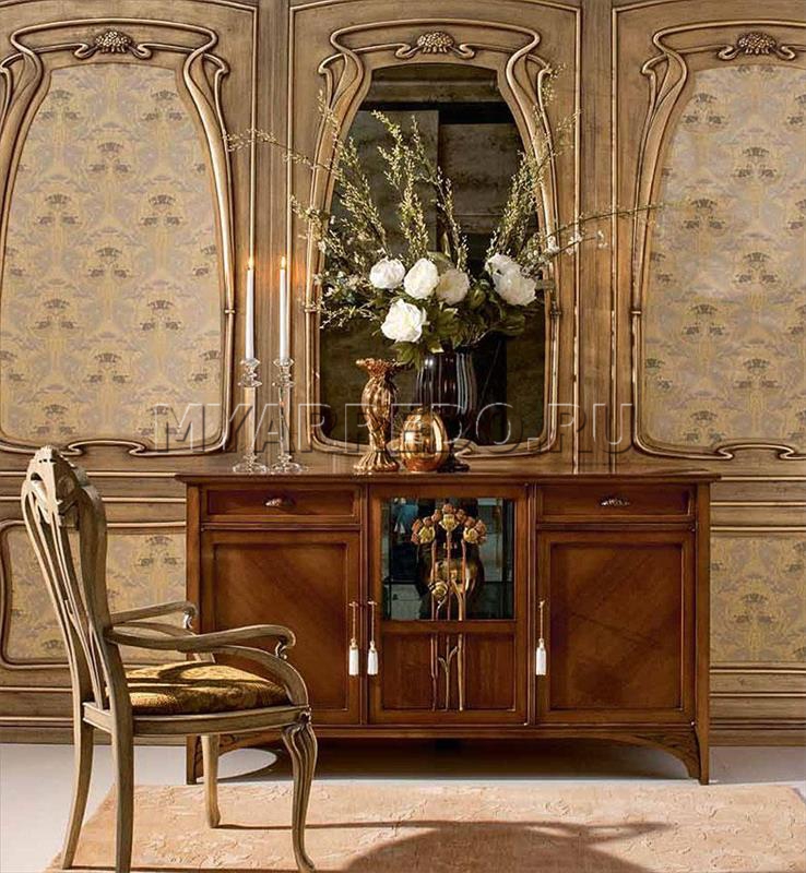 Il cassettone a tre porte con due cassetti è presentato dalla fabbrica MEDEA nella Liberty collection. La porta centrale è realizzata con l'aggiunta di vetro e decorata con elementi intagliati. Le maniglie delle porte sono decorate con nappe. Sono possibili altre finiture.