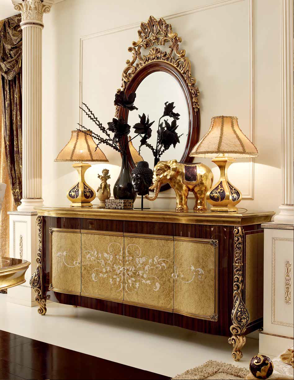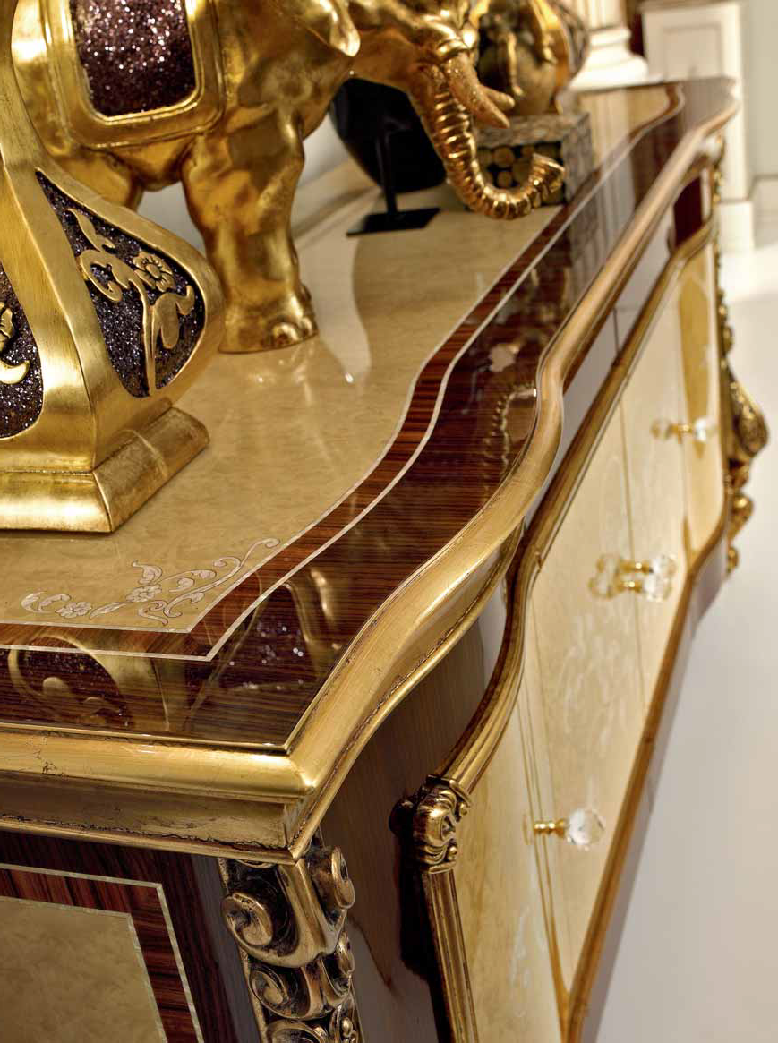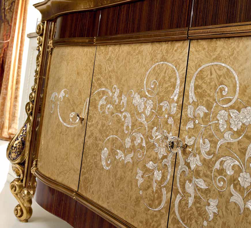 La cassettiera a quattro porte con gambe curve intagliate è presentata dalla fabbrica A. R. ARREDAMENTI SRL nella collezione ROYAL PALACE. Realizzato in legno massello naturale, decorato con intarsi e arte intagliare a mano