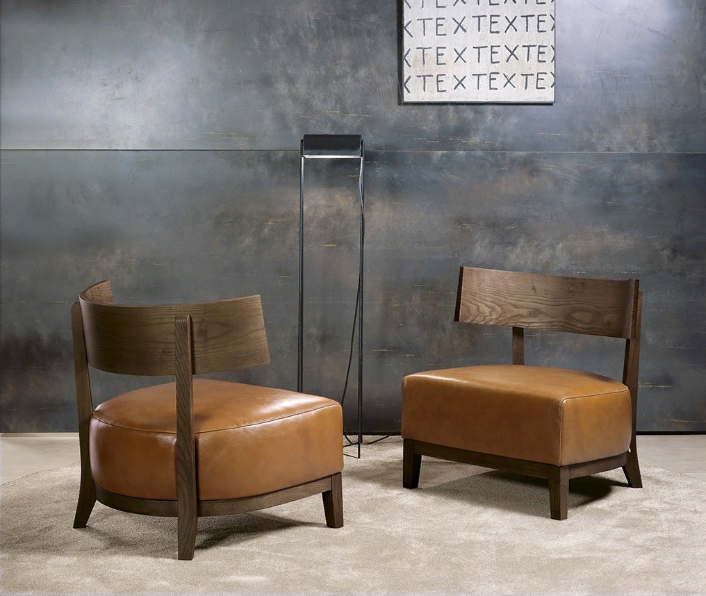 Poltrona, schienale rigido. Riempimento-poliuretano. Sono possibili altre finiture e rivestimenti.